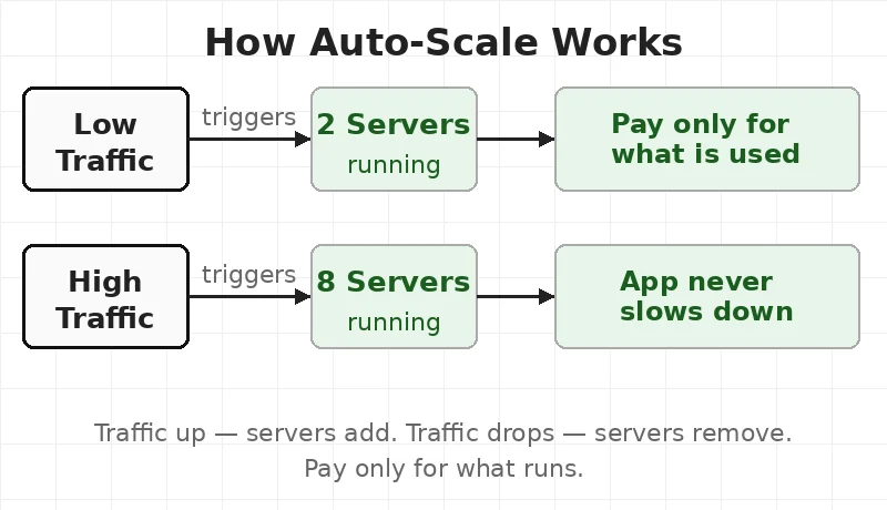 Auto-scale does the same for servers. More people visit the app — it adds servers. People leave — it removes servers. The team pays only for what is on.