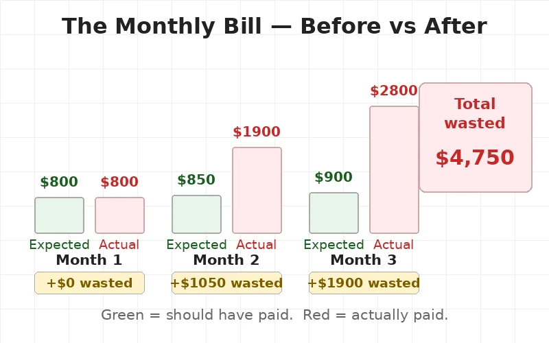 Month one — $800. Fine. Normal. Month two — $1,900. Strange. Month three — $2,800. Nobody knew why.