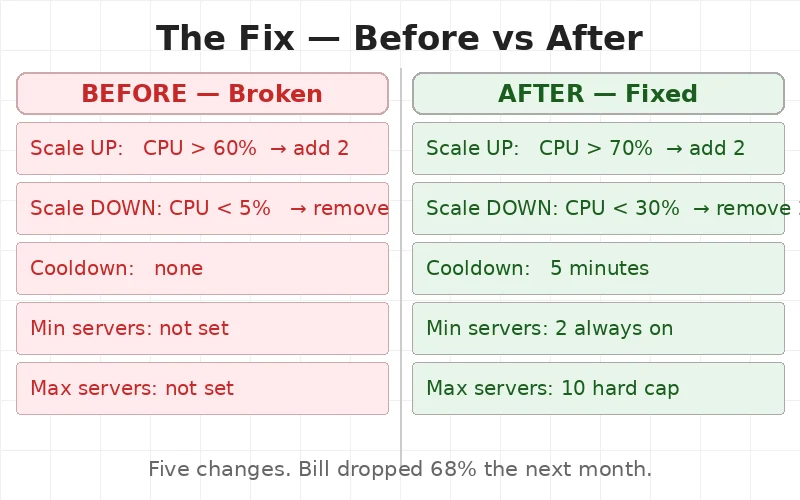 Scale-down moved from 5% to 30%. Now servers could actually leave. The cooldown stopped the system from panicking. The minimum kept 2 servers always ready. The maximum stopped the bill from running wild.