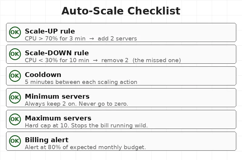 - Scale-down rule — when to remove servers (CPU < 30% for 10 min)