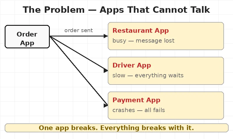 Each app sends its message to Kafka. Other apps read from Kafka when they are ready. Nobody waits. Nothing breaks.