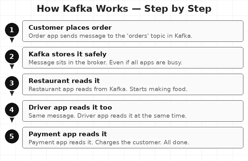 This is called decoupling — a simple word that means apps do not depend on each other. The order app does not care if the restaurant app is slow. It just sends to Kafka and moves on.