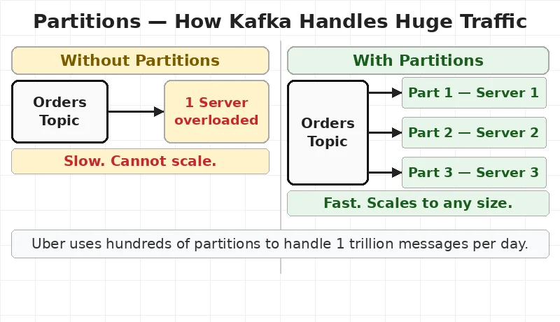 This is how Uber handles 1 trillion messages per day. One topic is split into hundreds of partitions. Each partition runs on a separate server. The load gets shared.